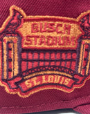 The front logo in russet with burgundy outline is the perfect representation of the team, giving it a modern and stylish appeal that any Cardinals fan would love. Baseball bat in metallic copper with burgundy outline. The Busch Stadium Final season side patch on the left mid-panel adds a unique touch to the design, commemorating a special moment in the team's history.